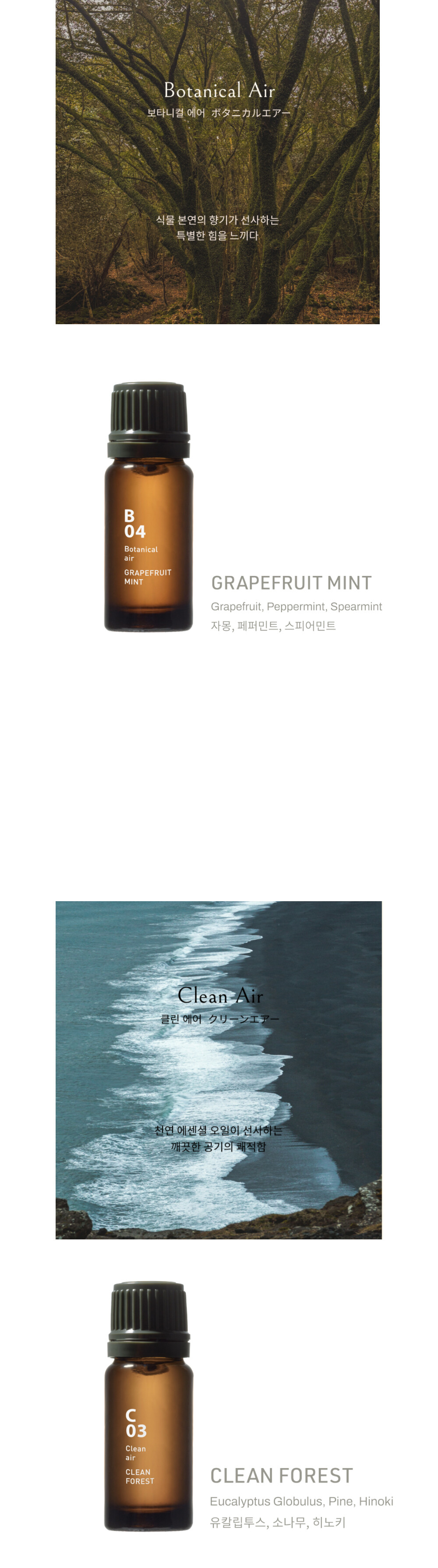 클린 에어는 공기를 정화하는 유칼립투스, 시원한 기분을 느끼게 하는 페퍼민트 등의 원재료를 블렌딩하여,