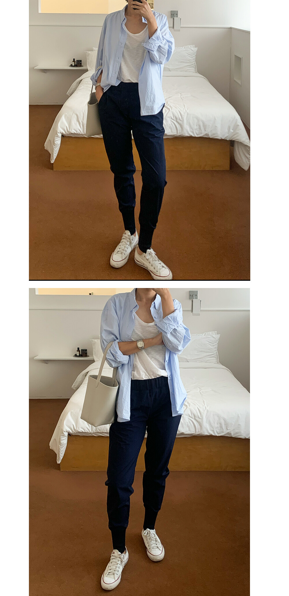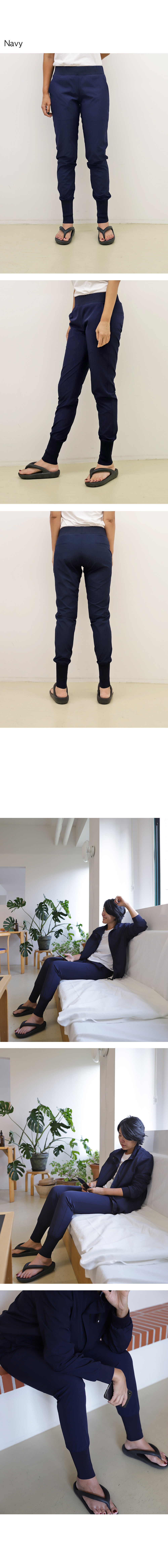 조거팬츠의 발목부분의 밴드가 너무 길게 느껴지실때는 안쪽으로 접어서 입으시면 조금 더 캐쥬얼한 무드로 연출 하실 수 있어요.